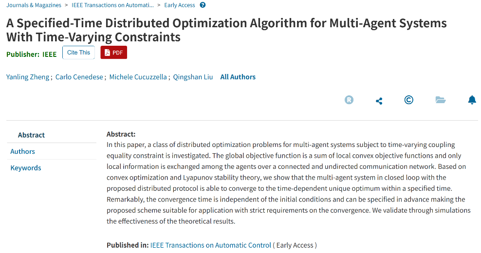 动力系统与可积系统团队郑燕玲博士与合作者在控制领域国际顶级期刊 《IEEE Transactions on Automatic Control》(IEEE TAC)上发表论文 “A Specified-Time Distributed Optimization Algorithm for Multi-Agent Systems With Time-Varying Constraints”(点击阅读)。郑燕玲博士为第一作者,苏黎世联邦理工学院高级研究员Carlo Cenedese 为第二作者,荷兰格罗宁根大学Michele Cucuzzella 教授和东南大学刘庆山教授为共同通讯作者,浙江科技大学为第一单位。该研究获得了浙江科技大学基本科研专项基金、国家自然科学基金及瑞士国家科学基金资助。
