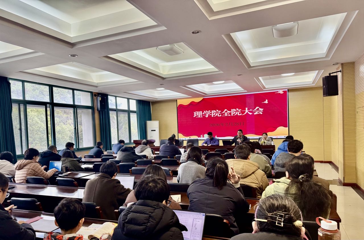 召开2026年首次全院大会暨教职工政治理论学习会,深入学习贯彻上级重要精神,全面部署新一年学院发展各项工作,明确发展方向与攻坚任务。会议由院长骆钧炎主持,学院党政班子成员及全体教职工参加。